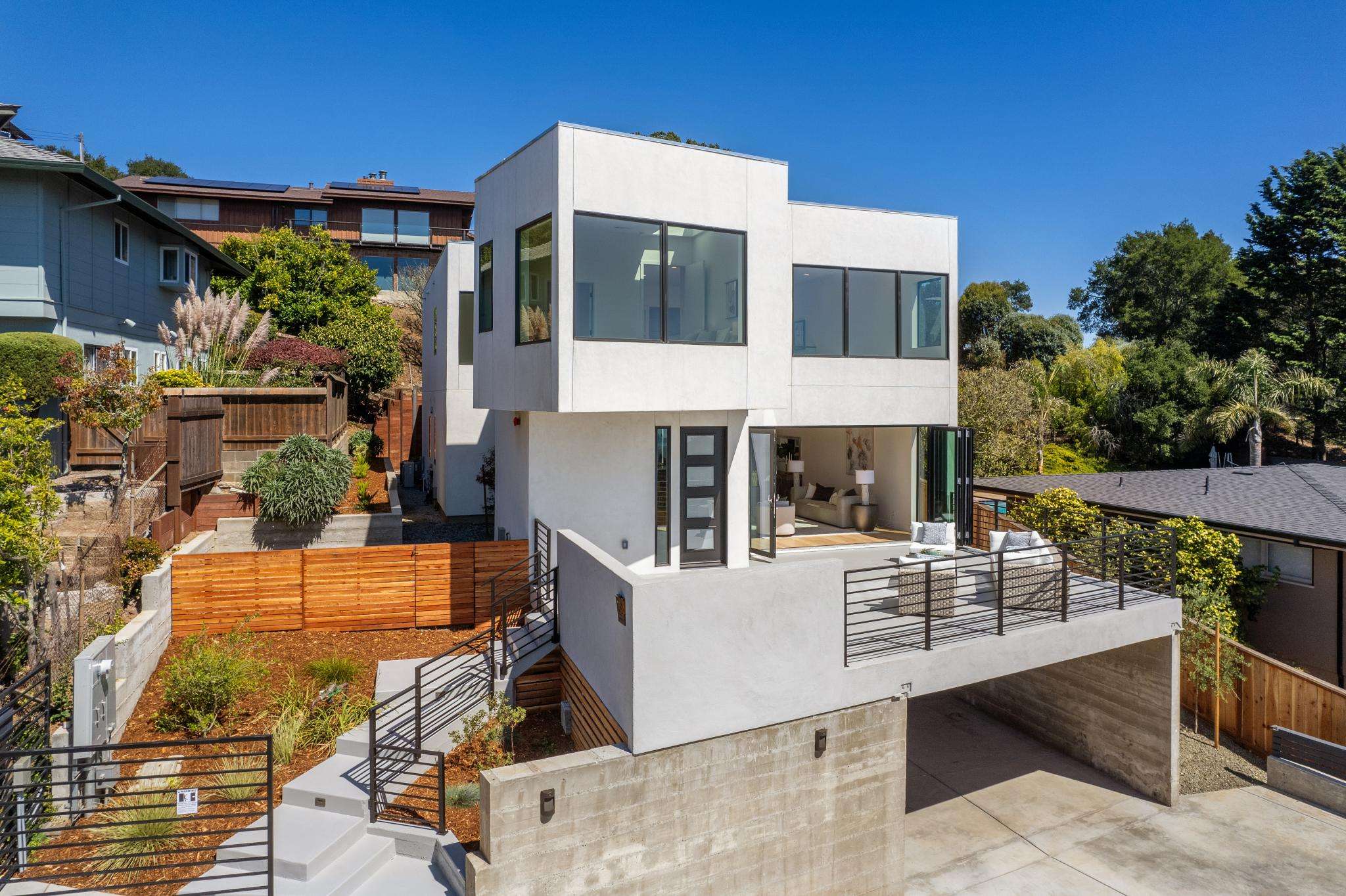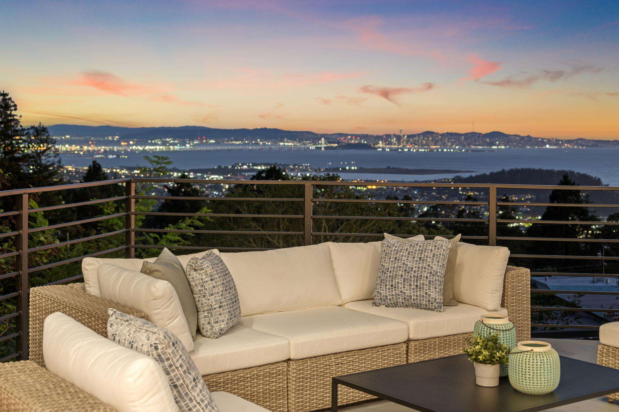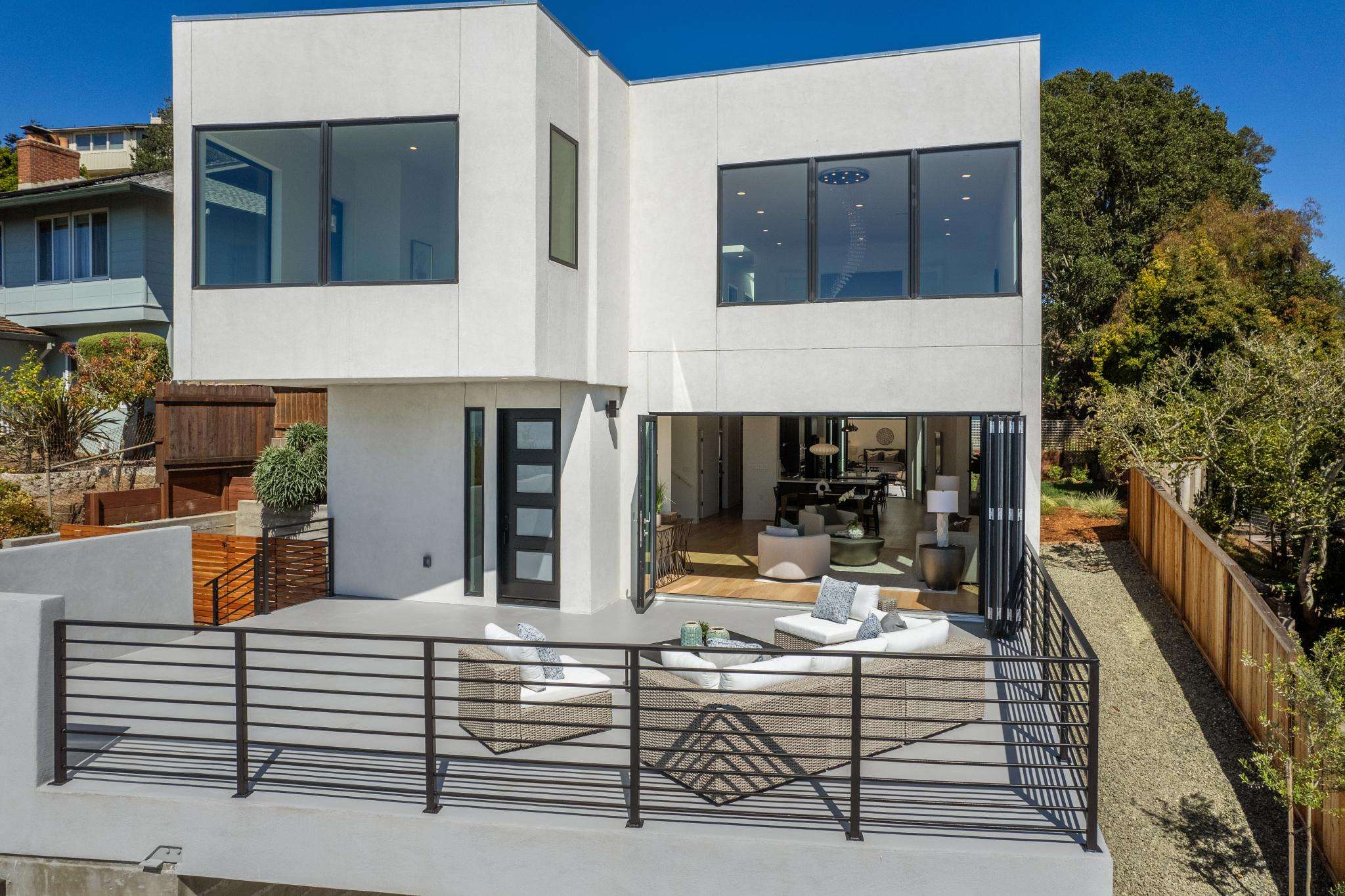 Elegantly elevated at the end of the cul-de-sac on a .35 acre lot, the home opens up with an expansive patio that provides a dramatic entry and offers an ideal elevation from which to soak in the stunning bay and bridge views during the day, twilight and especially at sunset. Beyond the foyer lies a window to a serene Rock Garden while the home opens up to a grand great room, elegant dining area and an open kitchen complete with a breakfast bar, center island and breakfast nook. Accordion doors at each end of the house provide abundant natural light and enhance the seamless indoor-outdoor flow. The flow perfectly blends living areas with the surrounding landscapes - ideal for both grand entertaining and intimate daily living. On the second level, the primary suite awaits with a front-facing sitting area surrounded by glass railings and breathtaking bay views. Two additional generously sized bedrooms and a spa-like bathroom complete this level of the home. Additionally, a ±336sq detached studio (plumbed and mini split for HVAC) offers a versatile bonus space for additional living space, guest room, office, exercise room, art studio, etc.